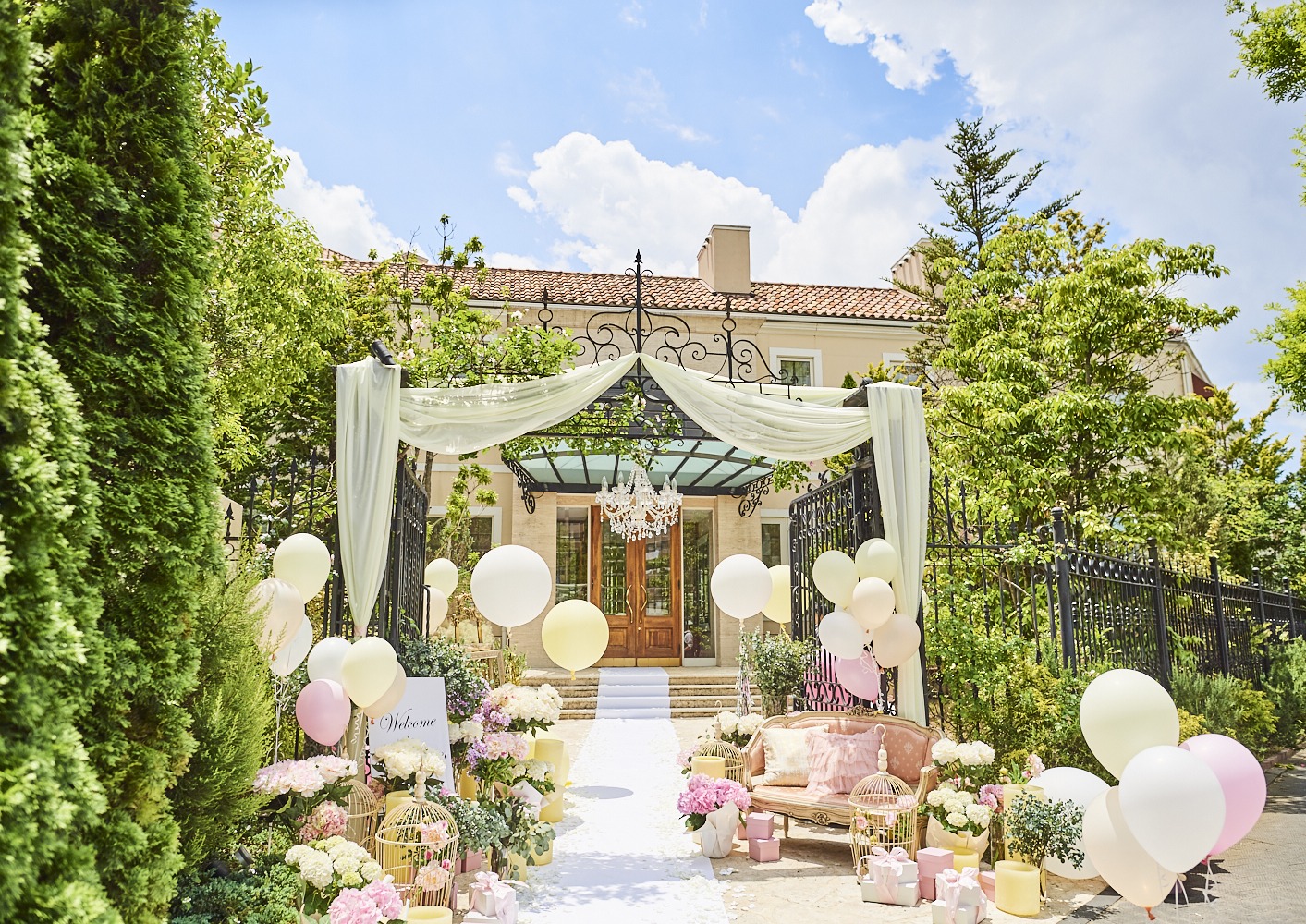 エントランスのデコレーションは、ゲストのパーティへの期待感をさらに高めてくれます